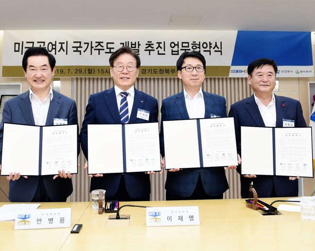 이재명 경기도지사와 최종환 파주시장, 안병용 의정부시장, 최용덕 동두천시장은 29일 오후 경기도청 북부청사 상황실에서 이 같은 내용의 ‘미군공여지 국가주도개발 추진 협약’을 체결했다. 이날 협약식에는 박정·홍문종·김성원 국회의원, 김원기 경기도의회 부의장, 조성환·손희정·김경일·이진·최경자·권재형·유광혁·김동철 도의원 등 관계자 20여명이 참석했다.