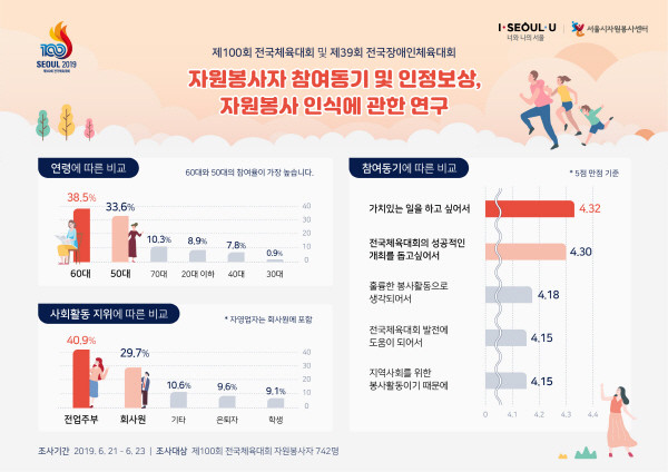 서울시자원봉사센터가 제100회 전국체육대회 및 제39회 전국장애인체육대회 자원봉사자 7,777명의 참여동기 및 자원봉사 경험인식에 대해 조사하고 결과를 내놨다. 이번 연구는 2018년 평창 동계올림픽 자원봉사자의 조사결과와 비교하여 시사점이 크다.