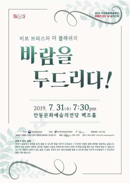 7월 문화가 있는 날 콘서트 ‘비보 브라스와 더 플래쉬의 바람을 두드리다’가 오는 31일 저녁 7시 30분 안동문화예술의전당 백조홀 무대에 오른다.