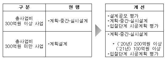 중소규모 사업은 모든 설계단계로 확대하되, 업체 부담과 국내 인프라 현황 등을 고려하여 시행 전 유예기간을 둘 예정이다.