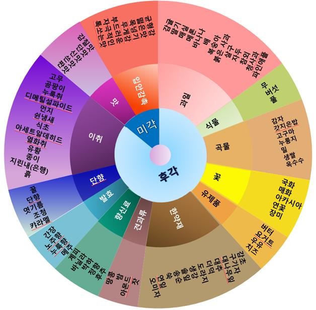 이번에 개발된 전통주 플레이버휠은 전통주의 맛과 향을 대표하는 89개 단어들을 크게 후각 11개, 미각 2개의 유형으로 묶어 구성한 것이다.