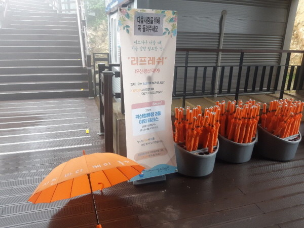‘리프레쉬’ 양산·우산 대여서비스는 무더위와 갑자기 쏟아지는 비로 각산전망대에 오르기 힘든 케이블카 고객들을 위해 보다 더 상쾌한 여행이 될 수 있도록 바라는 마음에서 기획한 것으로, 누구나 자유롭게 사용하고 자율적으로 반납하면 된다.