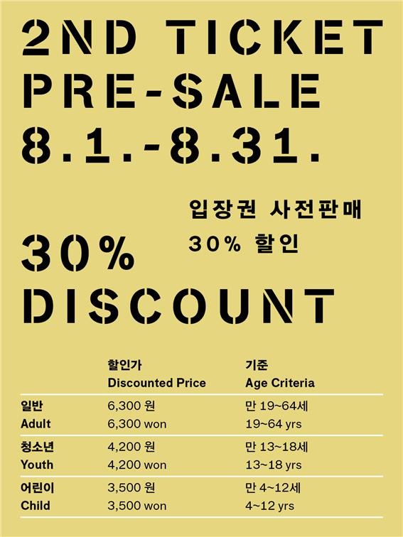 입장권은 비엔날레 홈페이지를 비롯해 네이버 예약, 티켓링크, 티몬, 위메프 예매사이트에서 구매 가능하다.