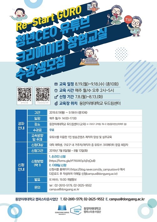 구로구 동양미래대학교가 내달 13일까지 ‘RE-Start Guro 청년 CEO 유튜브 크리에이터 창업교실’ 수강생을 모집한다.