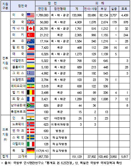6․25전쟁 유엔참전국 참전 및 피해 현황
