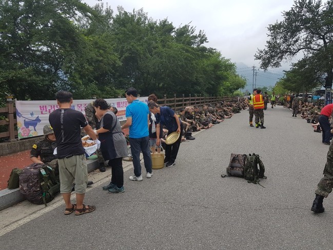 양구군 남면상가번영회 고성복 회장을 비롯한 20여 명의 회원들은 지난 29일 오후 2사단 신병교육대 앞에서 신병교육을 받기 위해 입소하는 250여 명의 장정들과 1천여 명의 가족 및 친구들에게 직접 구운 와플과 미리 시원하게 준비해온 오미자차를 무료로 나눠줬다.