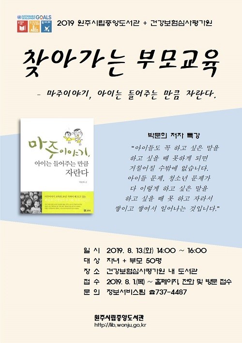 원주시립중앙도서관이 오는 8월 13일 오후 2시 건강보험심사평가원에서 찾아가는 부모교육 특강을 개최한다.