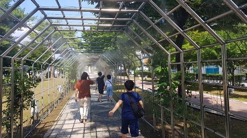 이번에 처음 설치된 쿨링포그는 정수 처리된 물을 노줄을 통해 분사해 주위 온도를 최대 5도까지 낮추고 미세먼지를 저감해주는 친환경 장치다.