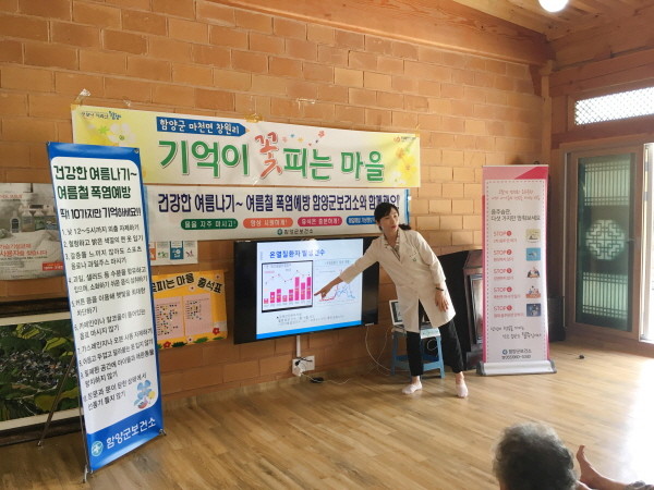 함양군보건소는 29일 함양군 장수마을인 마천면 창원마을 회관을 방문하여 마을 주민 30명 대상으로 폭염 대비 온열질환 예방수칙 교육을 실시했다.
