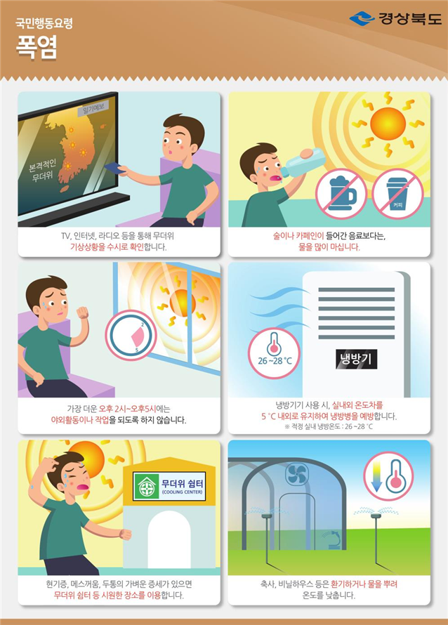 최 웅 경북도 재난안전실장은 “무더위가 지속될 것으로 예상되는 만큼 가장 무더운 시간대에는 외출을 자제하고 자주 물을 마시는 등 도민 스스로가 피해를 입지 않도록 각별히 신경써주기를 바란다.” 라고 당부했다.
