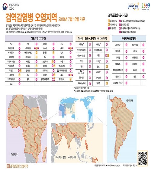 또 해외여행 시에는 필리핀 등 동남아지역에서는 장티푸스, 세균성이질 등 수인성·식품매개감염병 동남아 및 남미 등 따뜻한 기후의 국가에서는 뎅기열, 치쿤구니야열, 지카바이러스감염증 등 모기매개 감염병 서태평양 대부분 국가 등 전세계적으로 유행하고 있는 홍역 중동지역에서 지속적으로 발생하고 있는 중동호흡기증후군 등이 있다.