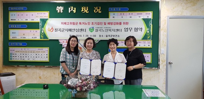 문귀정 치매안심센터장은“이번 협약을 계기로 치매고위험군 독거노인에 대한 치매관리사업이 원활히 추진 될 것으로 기대한다”며“관내 유관기관과 유기적인 협력을 통해 치매 걱정 없는 칠곡군을 만들기 위해 적극 노력할 것"이라고 했다.