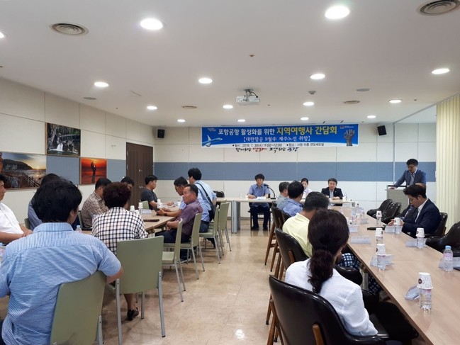 포항시는 30일, 시청 15층 연오세오실에서 포항공항 모객지원 등 포항공항 활성화를 위한 포항·경주지역 여행사, 대한항공, 포항공항공사 등 40여명이 참석한 가운데 “포항공항 활성화를 위한 지역여행사 간담회”를 개최했다.