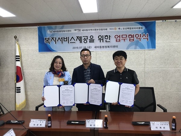 세마동행정복지센터 최선호 동장은 "지역 복지 발전에 모범을 보여주는 오산백합로타리클럽에 감사를 드리며, 이번 협약을 통해 복지사각지대를 해소하고 폭넓은 복지서비스를 제공하여 행복한 세마동 만들기에 앞장서겠다."고 소감을 전했다.