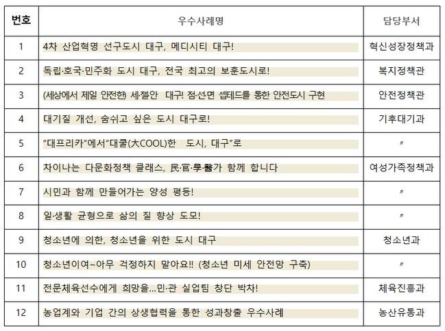대표적인 우수사례는 대프리카에서 대쿨한 도시, 대구로 4차 산업혁명 선구도시 대구, 메디시티 대구 세·젤·안 대구 점·선·면 셉테드를 통한 안전도시 구현 청소년에 의한, 청소년을 위한 도시 대구 등 이다.