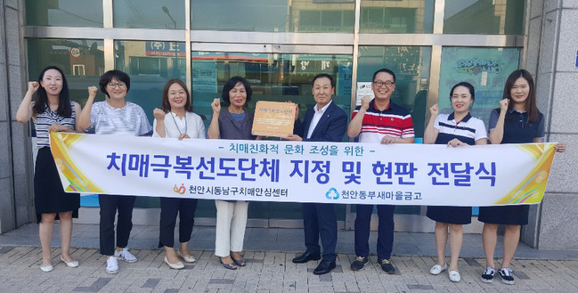 천안시 동남구치매안심센터는 지난 30일 원성2동 소재 천안동부새마을금고를 치매극복선도 단체로 지정하고 현판 전달식을 진행했다고 밝혔다.
