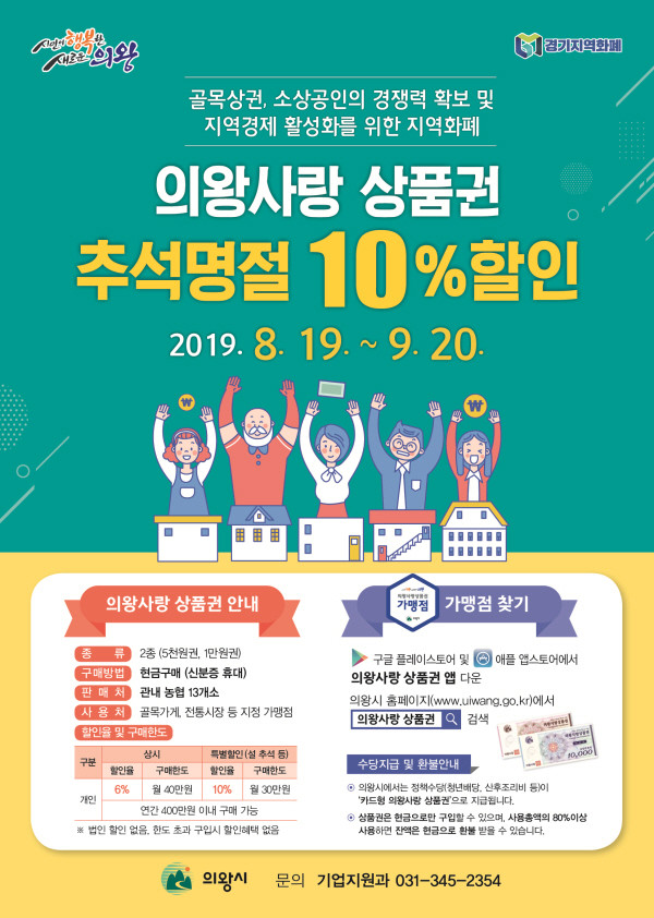 시는 지난 3일 의왕사랑 상품권 운영협의회를 개최하여 상품권 20억 원을 확대 발행하기로 협의하고, 추석 명절을 맞아 10% 특별 할인판매를 실시하기로 결정했다.