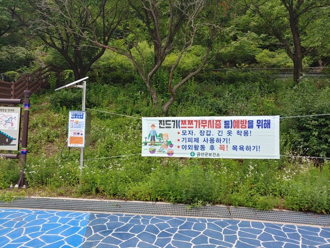 금산군보건소는 발열성 감염병의 원인인 진드기 및 모기 등의 접근을 막아 농작업 및 야외활동시 안전하고 쾌적한 환경 조성을 위해 관내 등산로 입구 및 공원 등에 해충기피제 자동분사기와 예방수칙 현수막을 설치했다.