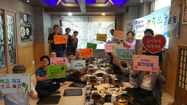 성주군 주민복지과와 성주군보훈단체연합회 임원 등 20여명은 지난 30일 관내 음식점에서 침체된 지역경제에 활력을 불어 넣기 위한 먹·자·쓰·놀 운동 전개의 필요성을 공감하고, 범군민 운동으로 확산시키기 위하여‘먹·자·쓰·놀 운동’ 협약을 체결했다.