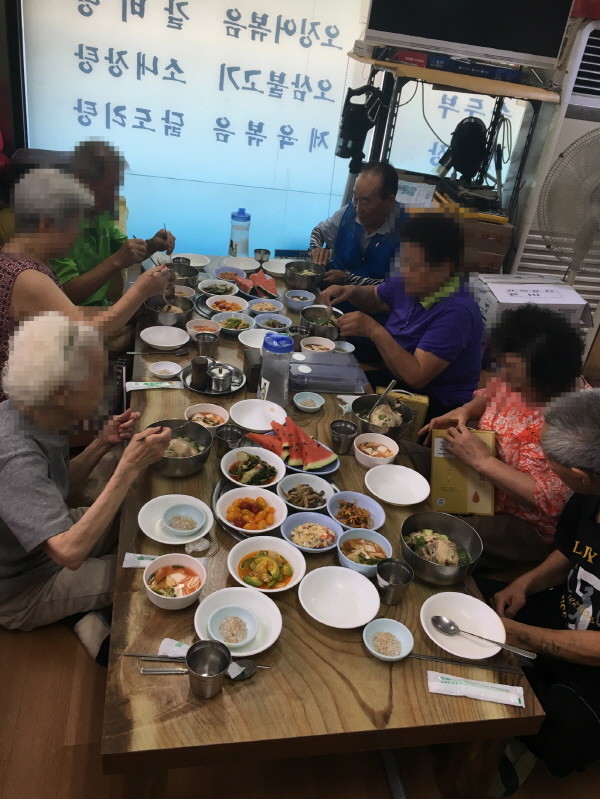 이번 달은 특별히 무더위에 지친 어르신들을 위한 보양식으로 삼계탕을 준비하고, 과일과 후식도 푸짐하게 차려 어르신들이 즐겁게 식사를 하시도록 대접했다.
