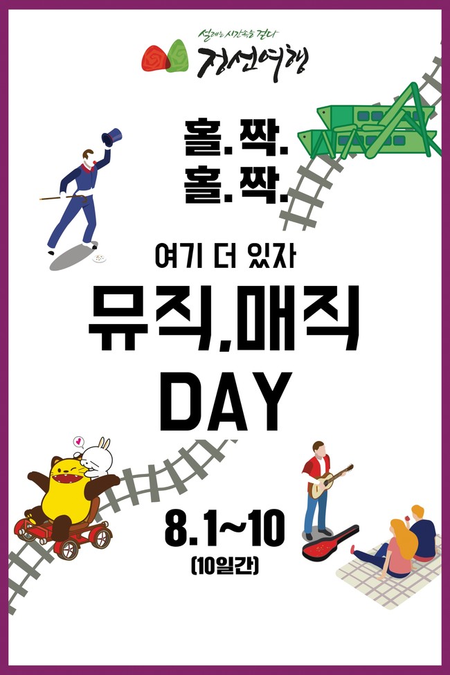 정선군의 대표 관광 브랜드인 정선 레일바이크 출발역인 구절리역과 종착역인 아우라지역에서 8월 1일부터 10일까지 10일간 하루에 2번 버스킹 공연 및 마슬 퍼포먼스 이벤트가 열린다.