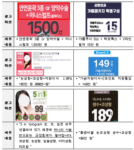 대표적인 의료법 위반 의료광고 내용으로는 주요화면에서는 할인금액만을 제시하고 자세한 광고 내용에서 사진 제공, 후기작성 등 조건을 부가하는 방식으로 환자를 유인하는 광고, 고가나 저가의 시술을 조합한 의료상품을 만들어 환자를 유인하고 불필요한 의료비 지출을 조장하는 광고, 시술 및 수술의 부작용이 없다고 홍보하는 거짓광고, 전세계 최초 최저가라고 과장하는 광고 등이 적발됐다.
