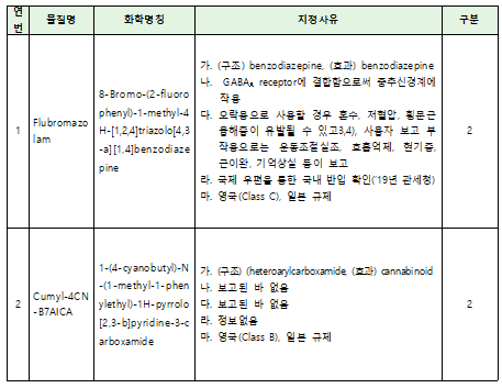 이번에 새로 지정하려는 플루브로마졸람은 오락용으로 사용할 경우 혼수, 저혈압 등이 유발될 수 있고 국내 밀반입 사례가 있었으며,Cumyl-4CN-B7AICA는 보건위생상 위해발생 가능성이 있어 최근 일본에서 판매·소지 등 금지물질로 지정됐다.