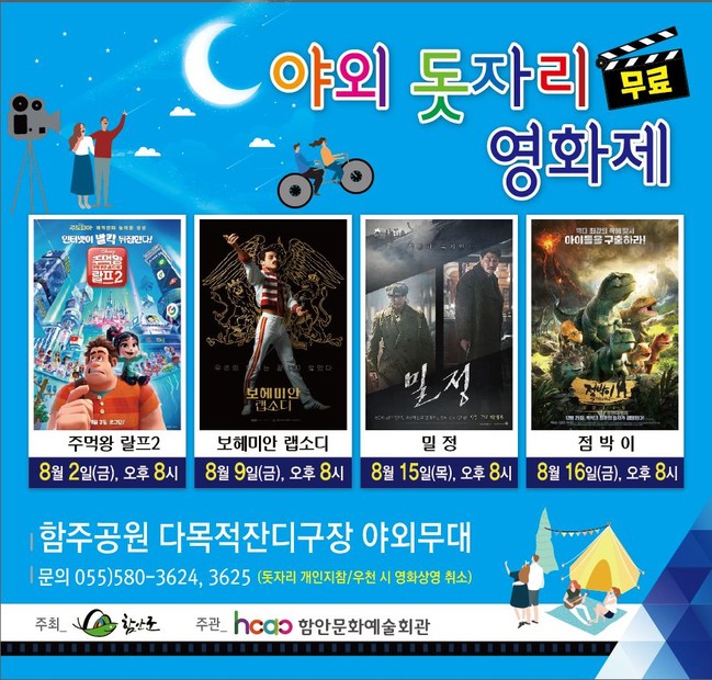함안군은 야외에서 돗자리를 깔고 앉아 영화를 즐기는 ‘야외 돗자리 영화제’를 오는 8월 2일, 9일, 15일, 16일 함주공원 다목적잔디구장 야외무대에서 개최한다.