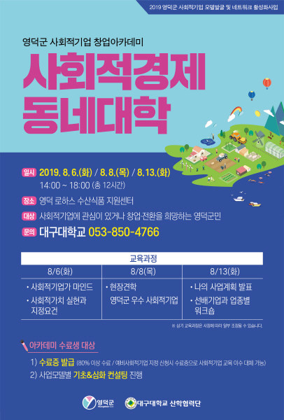영덕군과 대구대학교 산학협력단은 오는 8월 6일 영덕 로하스수산식품센터 대회의실에서 사회적기업의 창업 및 전환을 돕기 위한 “사회적기업 창업아케데미 사회적경제 동네대학”을 개강한다고 밝혔다.