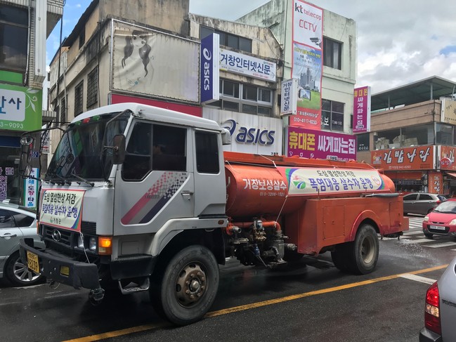 거창군은 최근 폭염특보가 연일 지속됨에 따라 지난 30일부터 살수차를 이용, 거창읍 시가지에 물 뿌리기 작업을 실시해 도심 열섬현상을 낮추는 등 폭염대응에 총력전을 펼치고 있다.