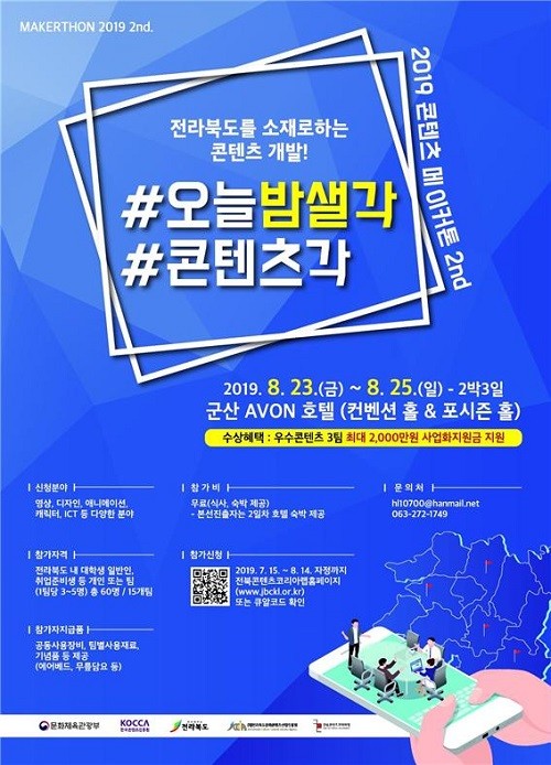 전라북도와 전라북도문화콘텐츠산업진흥원은 전라북도의 다양한 콘텐츠와 새로운 창작자를 발굴하기 위해 전라북도 콘텐츠 메이커톤 대회를 오는 8월 23일부터 3일간 군산 에이본호텔에서 개최한다.