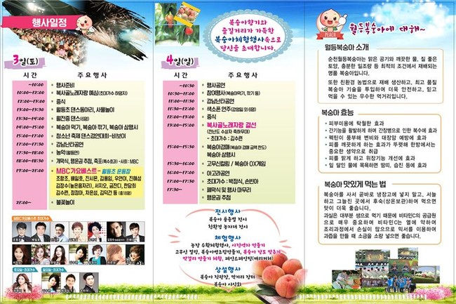 이번 행사에는 복숭아 막걸리, 병조림, 복숭아 당도맞추기, 수확체험, 삼행시짓기 등 복숭아와 관련된 다양한 체험행사가 준비되어 온가족이 함께 즐길 수 있으며, 현지가격으로 구매할 수 있는 복숭아 직판장을 운영할 예정이다.