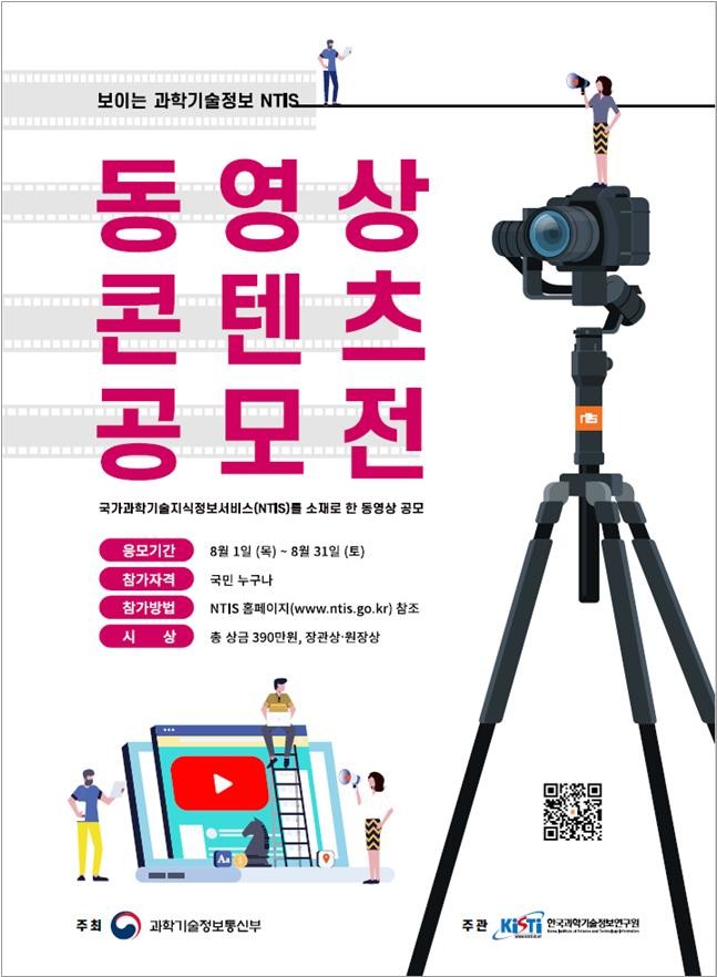 올해 처음 개최하는 이번 대회는 ‘보이는 과학기술정보 NTIS’를 주제로, NTIS를 창의적이고 흥미롭게 소개해줄 동영상을 공모한다.