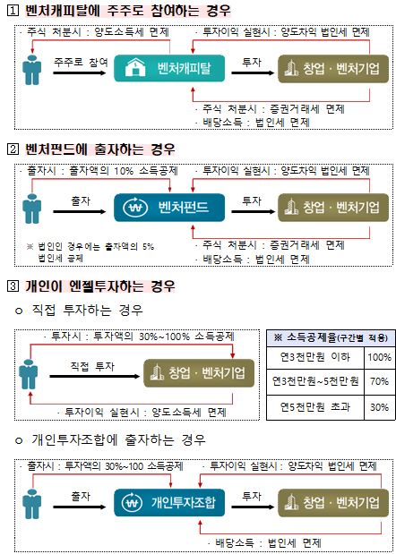 첫째, 벤처캐피탈이 신주를 매도할 경우에만 적용되었던 양도차익 비과세가 엔젤투자자가 3년 이상 보유한 구주를 인수·매도하는 경우까지 확대된다.