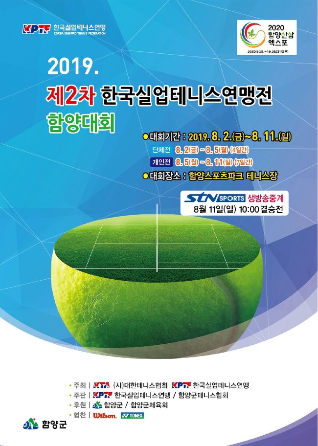 한국 실업 최고의 선수를 뽑는 2019년 제2차 한국실업테니스연맹전 함양대회가 오는 8월 2일부터 10일간 함양체육공원 테니스장 등지에서 개최된다.