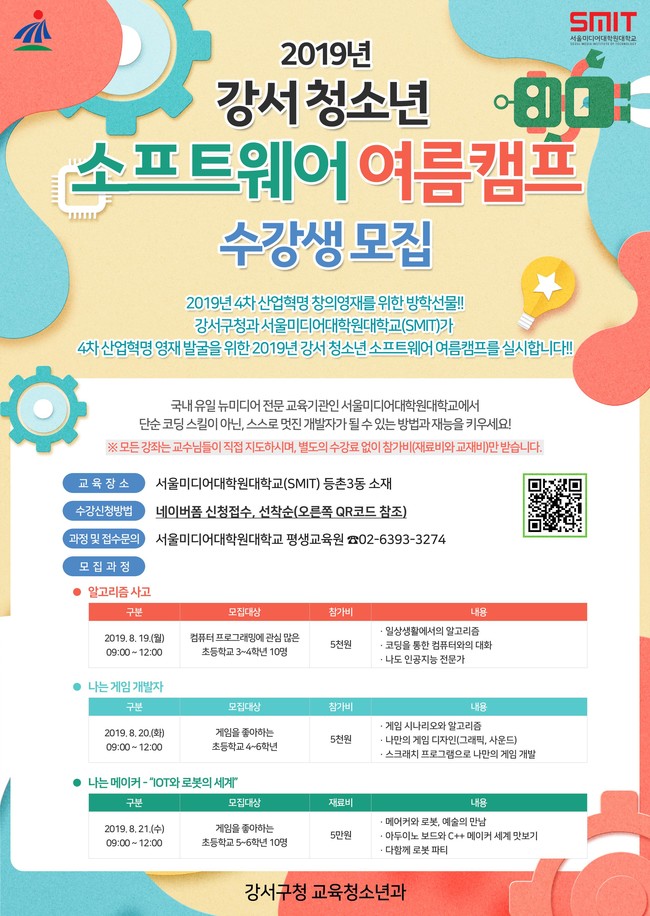 구는 지역 내 서울미디어대학원대학교와 손잡고 지역 초등학생들에게 창의성과 논리적인 사고를 길러 주고자 ‘강서 청소년 여름 소프트웨어 캠프’를 운영한다고 31일 밝혔다.