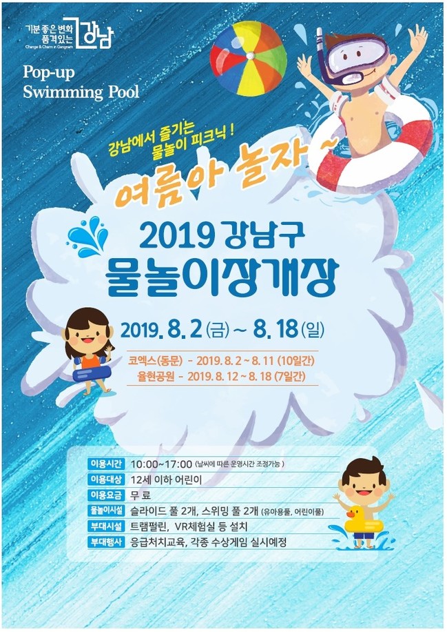 ‘기분 좋은 변화, 품격 있는 강남’을 구현 중인 강남구가 여름철을 맞아 유아·어린이들이 물놀이를 즐길 수 있도록 오는 8월 2일부터 18일까지 코엑스 동측광장과 율현 제4공원 다목적 구장에서 ‘팝업 스위밍 풀’을 무료로 운영한다.