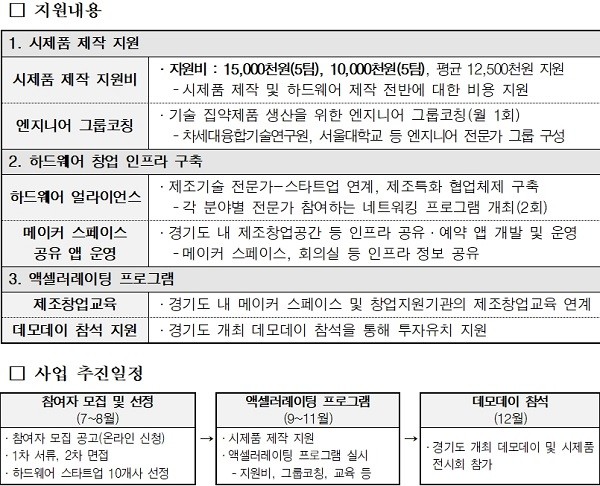 이번 사업으로 선정된 스타트업에게는 시제품 제작 및 하드웨어 제작 전반에 대한 비용, 1천만 원)이 지원되며, 벤처캐피탈·액셀러레이터 매칭 및 데모데이 참석 지원 등 다양한 투자유치 활동도 지원할 예정이다.