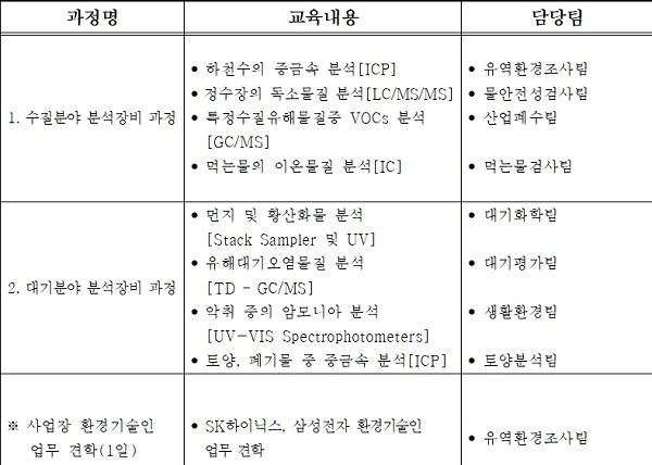 1개 과정 당 9~10명씩 총 19명이 참가하는 이번 교육에서는 유역환경조사팀 물안전성검사팀 산업폐수팀 먹는물검사팀 대기화학팀 대기평가팀 생활환경팀 토양분석팀 등 보건환경연구원 내 실무부서가 진행하는 다양한 분석 실무에 대한 교육이 진행될 예정이다.