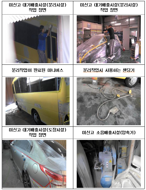 특히 도장·건조작업은 대부분 신고한 부스 안에서 이뤄졌으나 분리작업의 경우, 필터가 막히고 덥다는 이유로 공장 마당에서 하는 경우가 많았다. 일부는 신고한 부스 안에서 작업을 하면서도 한 면이 개방된 상태에서 분리작업을 실시해 오염물질이 외부로 유출되는 비정상적인 운영을 해오다 적발됐으며 주거지역에서 신고하지 않고 소음배출시설을 설치·운영하는 정비공장도 다수였다.