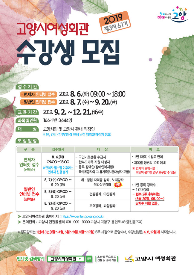 고양시 여성회관, 2019년 61기 정규강좌 수강생 모집