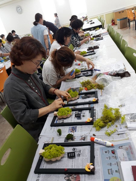 이번 교육은 스칸디아모스 원예 작품 만들기로 진행됐다. 스칸디아모스는 유해물질 제거가 뛰어난 식물로 공기정화, 새집증후군 탈취제거, 제습효과와 영양분 및 햇빛 없이도 잘사는 식물이다. 실내가 건조할 때는 딱딱해지고 습한 환경에서는 부드러워지고 가습효과가 높으며 생육기간도 10년 이상 오래 사는 특징이 있다.