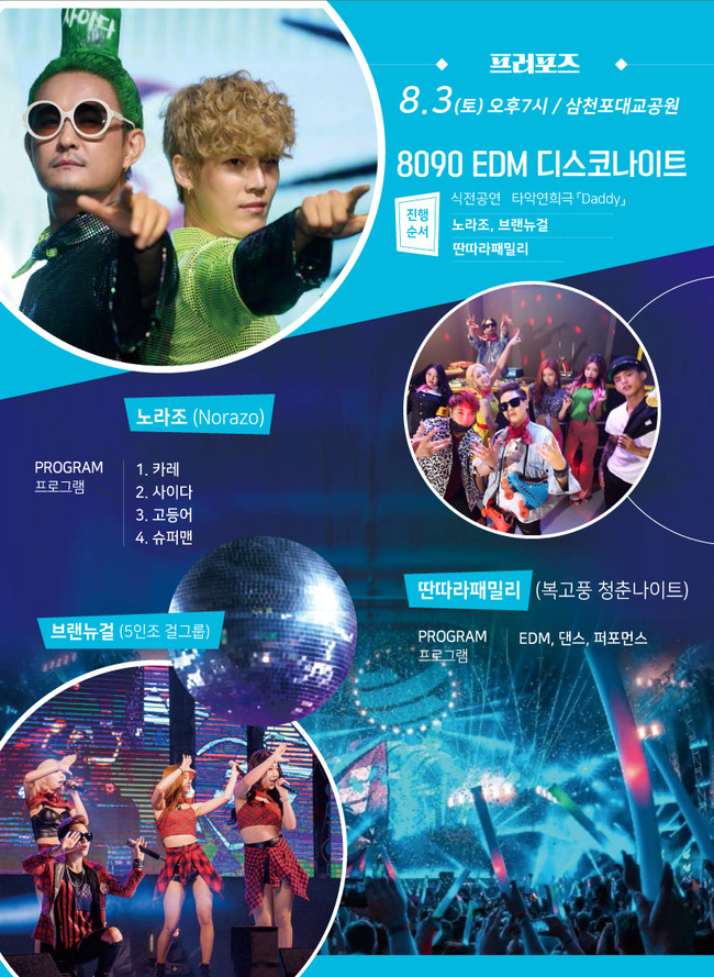 이번 ‘8090 EDM 디스코나이트’는 유쾌한 음악과 독특한 콘셉트의 독보적인 존재감으로 대중의 사랑을 받고 있는 ‘노라조’와 파워풀한 안무의 댄스 걸그룹 ‘브랜뉴걸’ 그리고 ‘딴따라 패밀리’의 복고풍 청춘나이트로 한여름 밤 삼천포대교공원의 무더위를 시원하게 날릴 예정이다.
