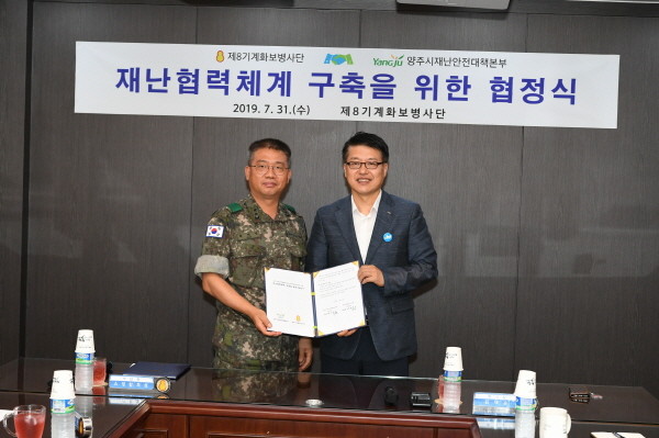 [경기=로컬라이프] 진용두 기자 =양주시와 제8기계화보병사단은 지난 7월 31일 사단 호국영웅실에서 재난협력체계 구축을 위한 업무협정을 체결했다.