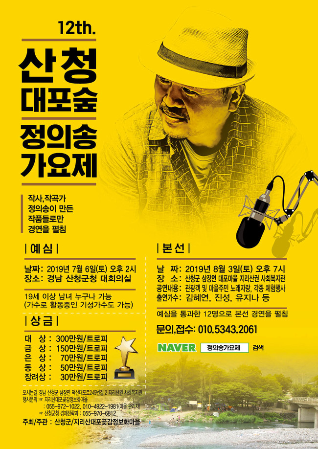 한여름 무더위를 날릴 ‘제12회 산청 대포숲 정의송 가요제’가 오는 3일 오후 1시 산청군 삼장면 대포마을에서 개최된다.