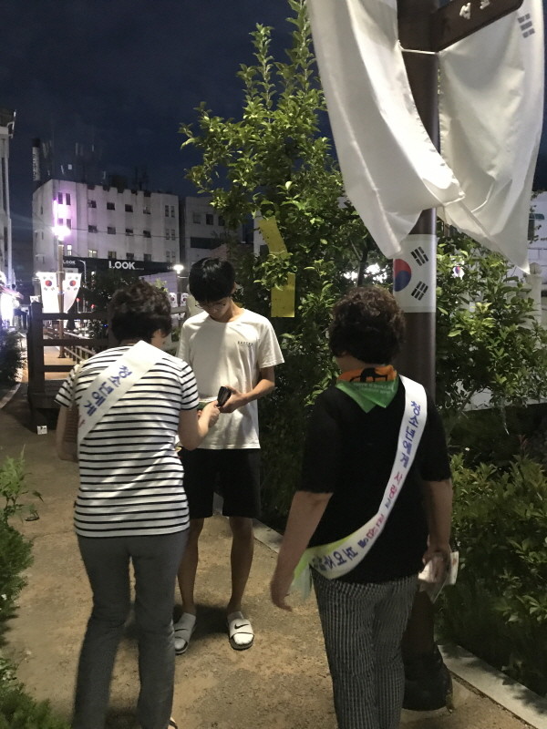 시민들을 대상으로 청소년보호 관련 홍보 전단지를 배부하고 있다.