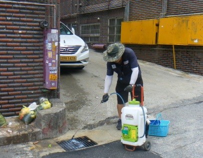 보건소는 관내 주택가 골목 일대를 직접 돌아다니며 차량 진입이 어려운 곳을 포함한 하수관로, 물웅덩이, 쓰레기 더미 등 모기 서식처가 될 수 있는 장소를 찾아 모기 유충 구제약을 투여하고 살충제를 분무 소독한다.