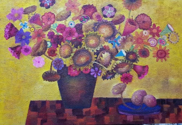 이번 전시는 ‘꽃세상’을 주제로, 인간사를 꽃으로 상징화해 다양한 색감으로 표현하고 있으며, 작가가 가장 중요하게 생각하는 ‘인연과 만남’을 새와 꽃, 집의 어울림 등으로 담아내고 있다.