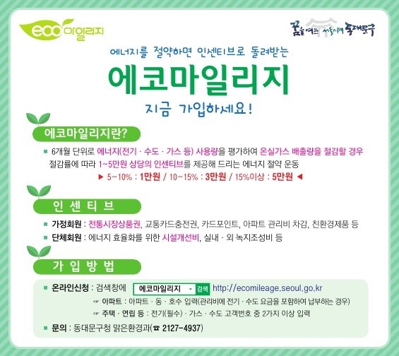 에코마일리지 가입을 희망하는 개인이나 단체는 에코마일리지 홈페이지, 동대문구청 맑은환경과, 동주민센터에서 신청하면 된다.
