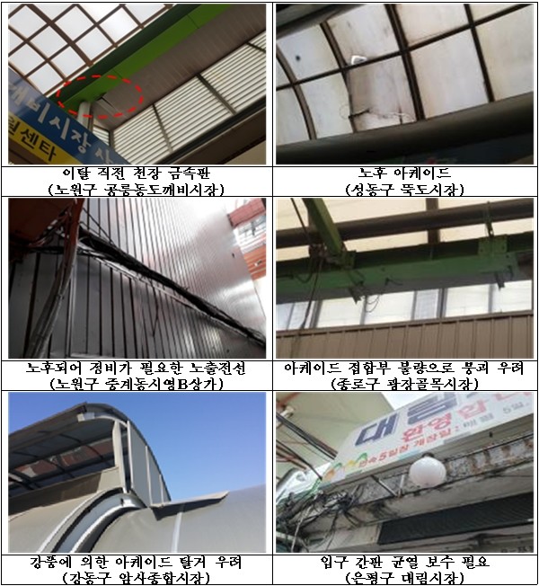 ‘공릉동도깨비시장’은 당초 신청한 아케이드 수리 외에 현장점검에서 천장 금속판 부식 및 낙하위험이 발견돼 추가로 보수를 실시한다. ‘대림시장’도 현장점검 도중 대형간판기초 부분에 콘크리트 균열이 발견돼 낙하사고 방지를 위한 긴급 수리에 들어간다.